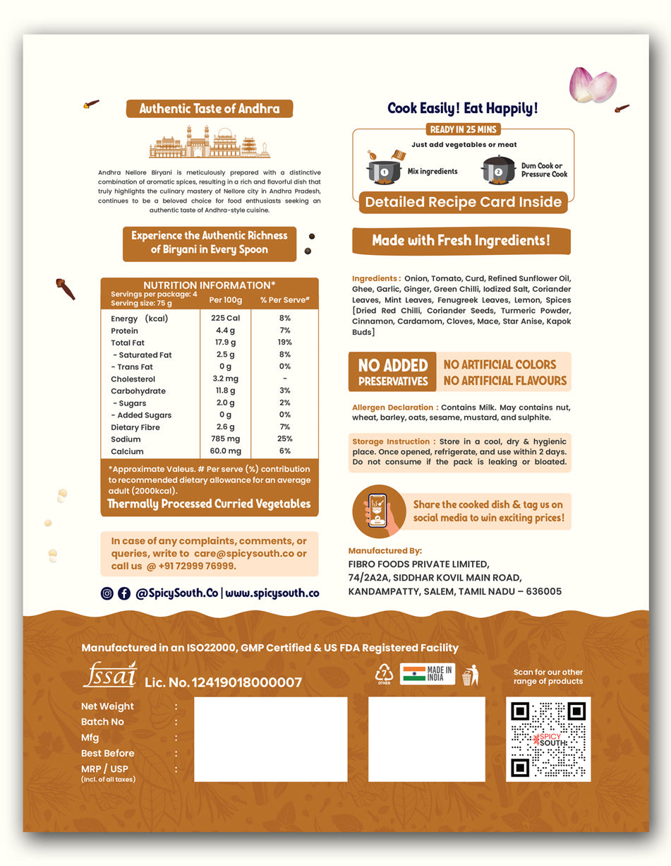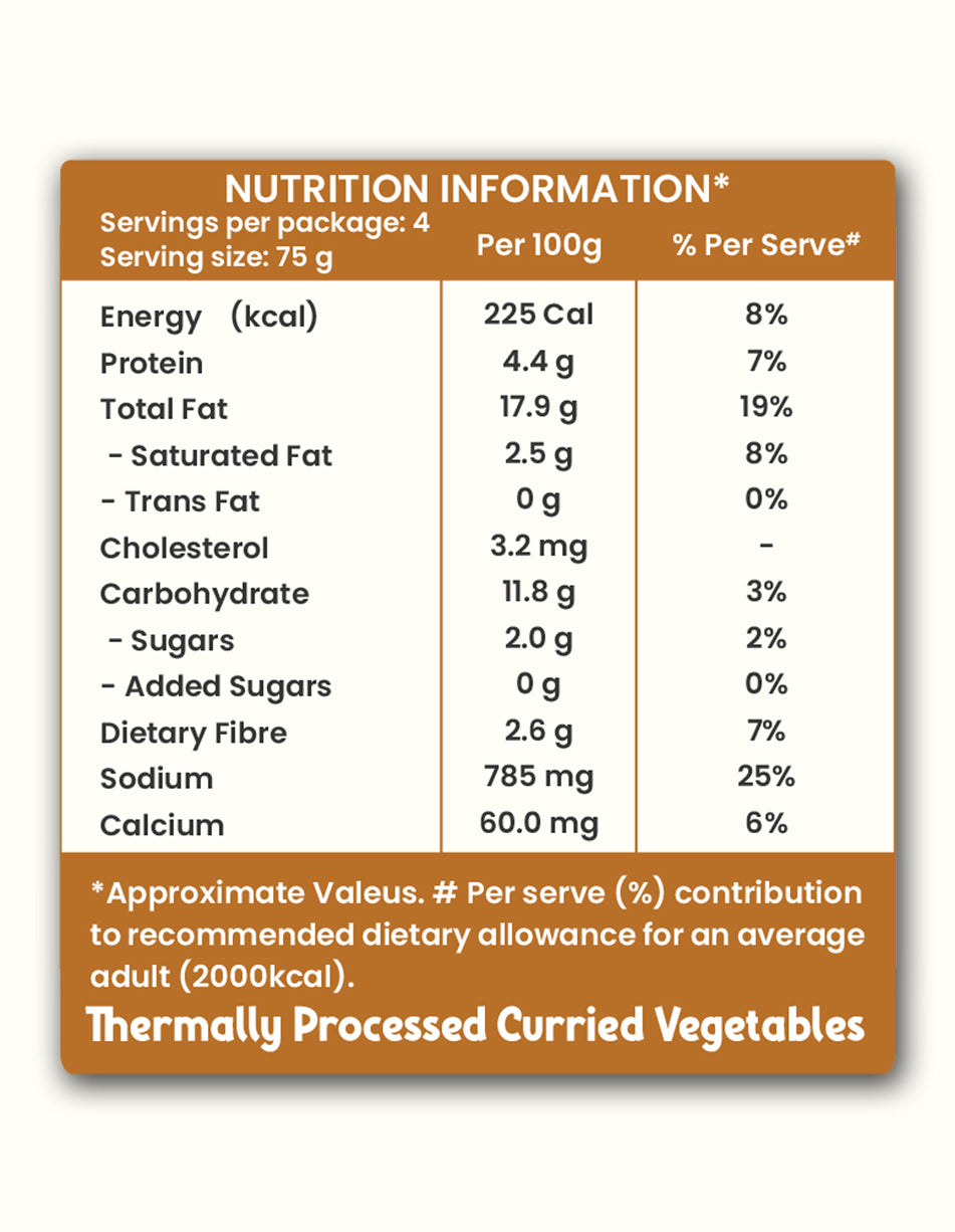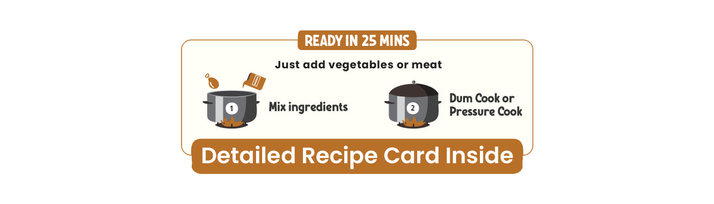 Onion, Tomato, Curd, Refined Sunflower Oil, Ghee, Garlic, Ginger, Green Chilli, Iodized Salt, Coriander Leaves, Mint Leaves, Fenugreek Leaves, Lemon, Spices [Dried Red Chilli, Coriander Seeds, Turmeric Powder, Cinnamon, Cardamom, Cloves, Mace, Star Anise, Kapok Buds]