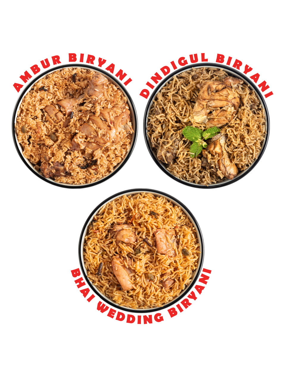 Experience the rich culinary heritage of Tamil Nadu with our exclusive Biryani combo featuring the diverse flavors of Ambur Biryani, Dindigul Biryani, and Bhai Wedding Biryani bundled together for you.