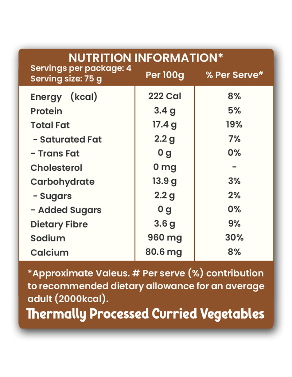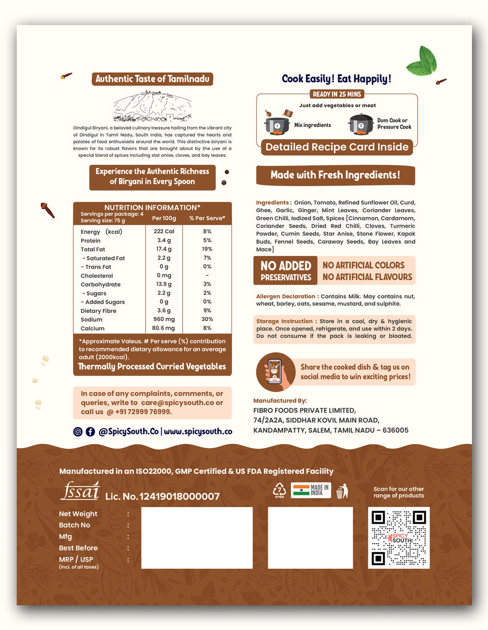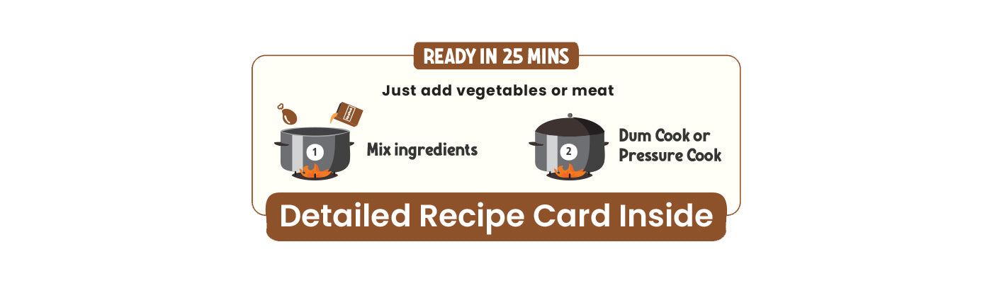 Onion, Tomato, Refined Sunflower Oil, Curd, Ghee, Garlic, Ginger, Mint Leaves, Coriander Leaves, Green Chilli, Iodized Salt, Spices [Cinnamon, Cardamom, Coriander Seeds, Dried Red Chilli, Cloves, Turmeric Powder, Cumin Seeds, Star Anise, Stone Flower, Kapok Buds, Fennel Seeds, Caraway Seeds, Bay Leaves and Mace]