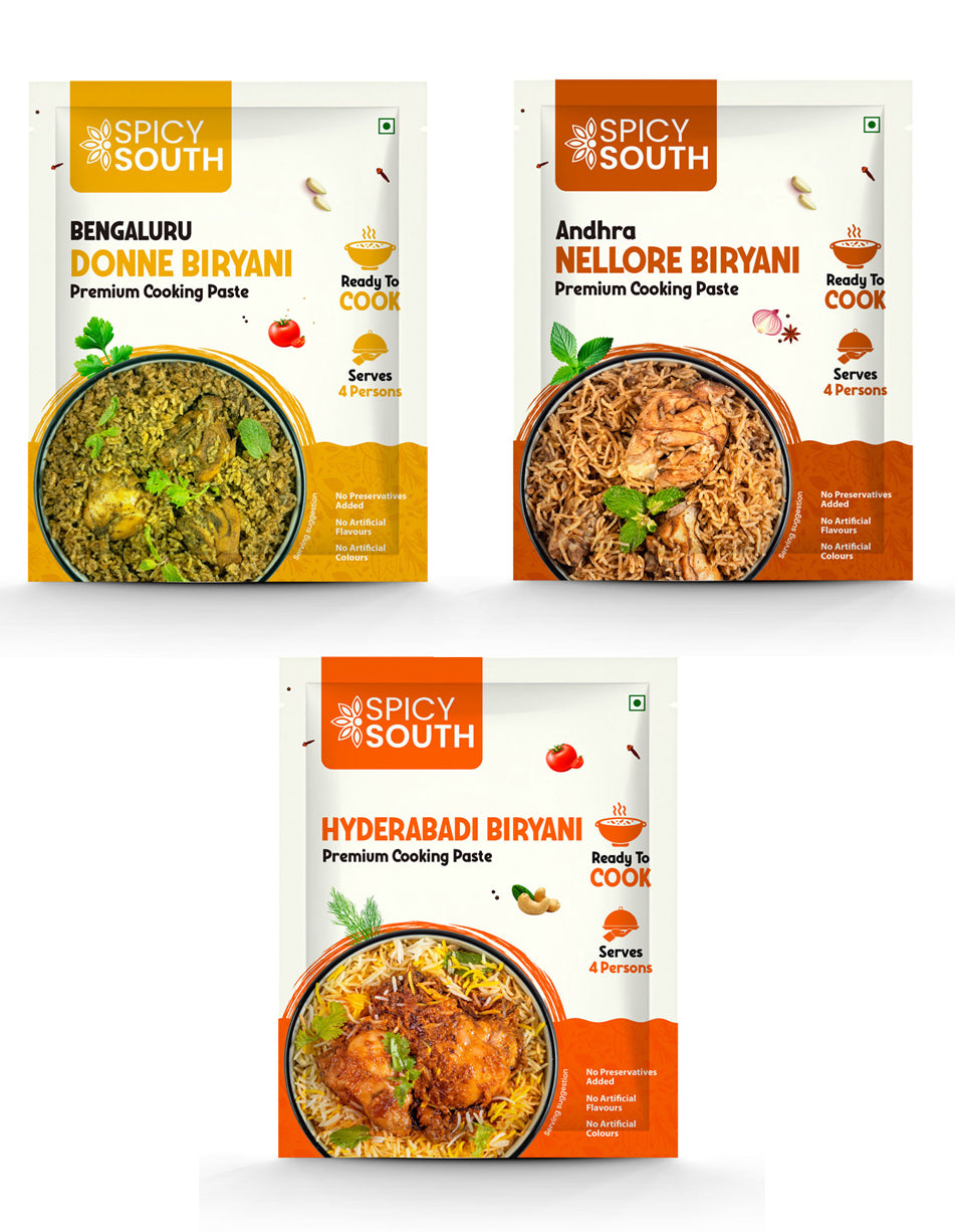 Experience the diverse flavors from Karnataka, Telangana & Andhra Pradesh with our exclusive Biryani combo featuring the culinary delights of Bengaluru Donne Biryani, Andhra Nellore Biryani, and Hyderabadi Biryani bundled together for you.